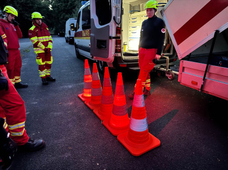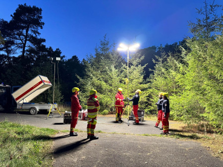 Ein weiterer Schwerpunkt lag auf dem richtigen Lichtaufbau. Eine fiktive Einsatzstelle wurde vollständig ausgeleuchtet, um die Wirkung verschiedener Lichtquellen zu demonstrieren. Dabei zeigte sich, wie entscheidend eine blendfreie und strukturierte Beleuchtung für die Orientierung und Sicherheit ist. Rotes Licht wurde gezielt eingesetzt, um die Dunkeladaptation der Augen zu erhalten, während Stirnlampen mit Dimmfunktion eine flexible Ausleuchtung ermöglichten. Auch die Markierung von Gefahrenstellen mit reflektierenden Elementen wurde geübt.
